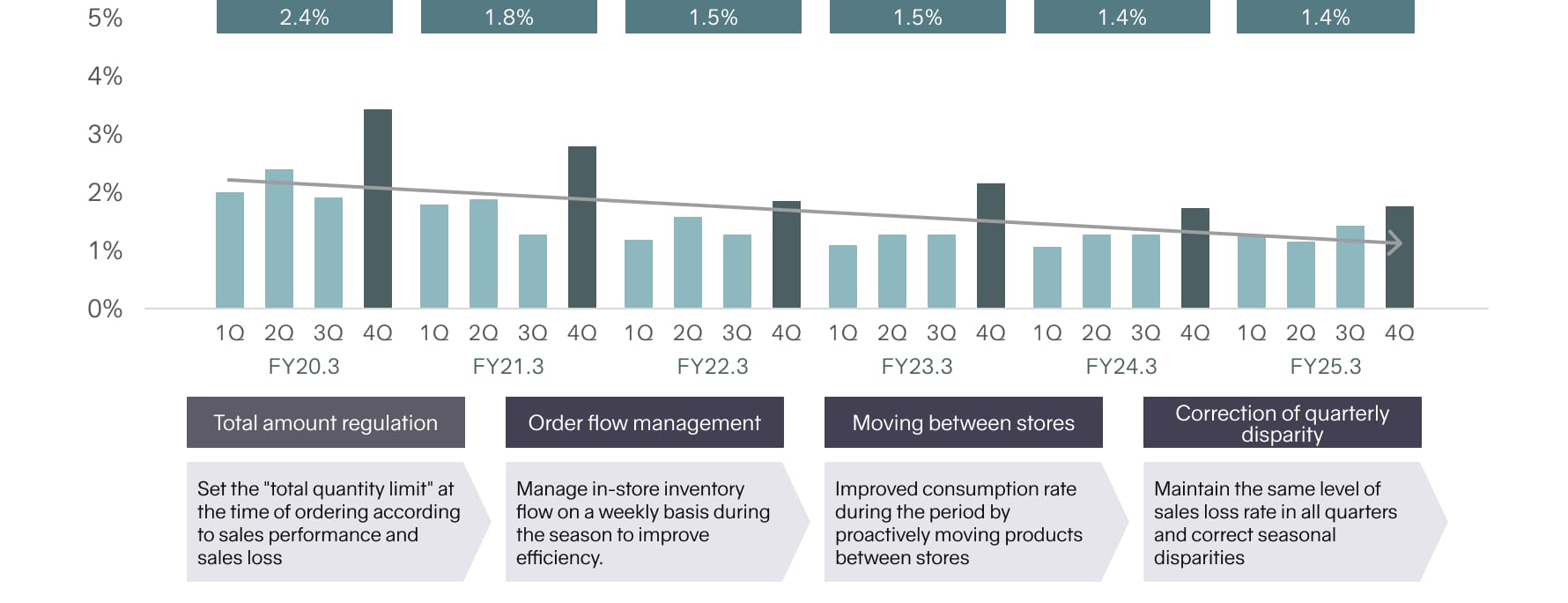 Inventories at the end of September were at 95% YoY, a level below the same period last year. By responding to actual demand for spring/summer products and improving the accuracy of our order flow, our lean inventory management approach has become standard practice. We opened 10 new stores in the first half, including overseas, and plan to open stores in major cities in the second half, including London, Seoul, and New York City.