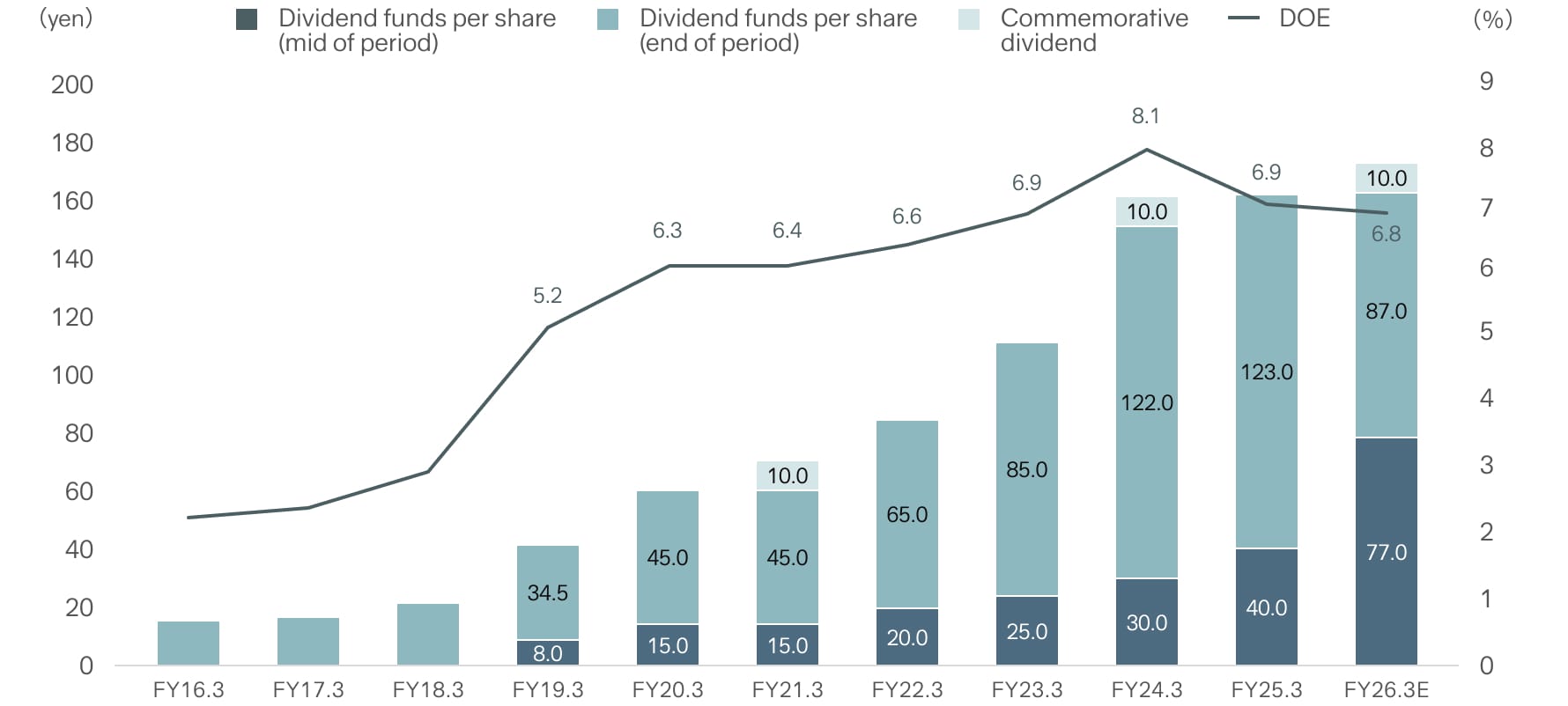 The interim dividend for FY2026.3 includes a 75th-anniversary commemorative dividend of 3.3 yen (10 yen pre-split). The year-end dividend is planned to be an ordinary dividend of 29 yen per share, bringing the total annual dividend to 58 yen.