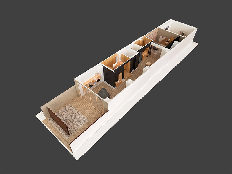Geological strata (chiso) are natural beauty in concrete form. Laid down over endless eons, they reveal themselves to us weathered by wind and rain in wild, open spaces. Meanwhile, Goldwin’s products embody functional beauty drawing on knowledge (chishiki) and insight (chiken) accumulated over long experience and patient achievement. Combining geological and intellectual strata gives the concept of “layered chi,” which finds embodiment in striking, fascinating materials to create the space that is Goldwin Kyoto.