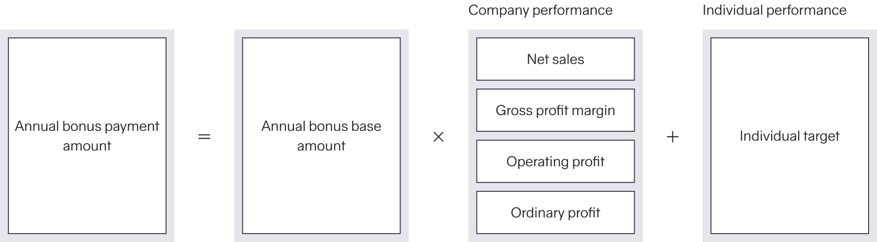 - Annual bonus: Short-term incentive linked to the Company’s and the individual’s performance in the current fiscal year, designed to strengthen awareness of annual performance improvement - Share-based remuneration: Medium- to long-term incentive linked to performance over multiple years, aimed at motivating sustainable growth and enhancement of corporate value over the medium to long term as well as promoting the sharing of value with shareholders