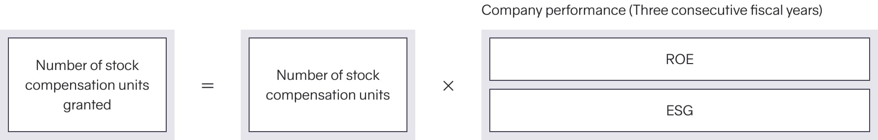 Share-based remuneration is performance-linked restricted shares granted to internal Directors according to the level of performance achievement of the Company for three consecutive fiscal years. Each fiscal year, the Company grants base units calculated based on the base stock price and the base amount determined by multiplying the total remuneration base amount as Director remuneration by a certain ratio. After the three consecutive fiscal years that starts from the fiscal year to which the unit grant date belongs, shares of the Company’s common stock are allotted with transfer restrictions on the basis of one unit per one share following adjustments to the number of units using a formula based on the performance evaluation figures of the Company and their composition ratios, as shown below, within a fluctuation range of 0-200%. The transfer restrictions are lifted at the time of retirement. The evaluation indicators and their composition ratios, as well as the maximum value, target value, and threshold value of each indicator for setting the fluctuation range of 0-200% for the payment amount of each individual, are determined by the Board of Directors following deliberation by the Nomination/Compensation Committee.
