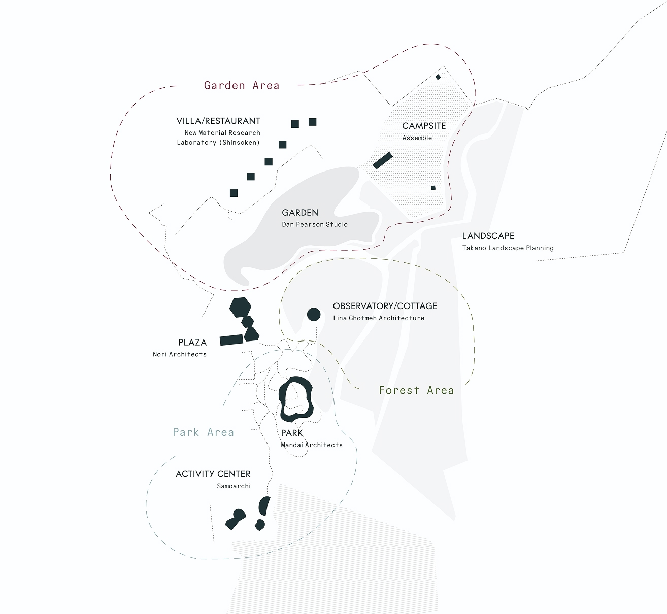 Play Earth Park Naturing Forestは「パークエリア」「フォレストエリア」「ガーデンエリア」という3つのエリアで構成され、全体のランドスケープデザインと6つの建築を、国内外の設計者8組が参画して開発を進めている。人と自然の新たな可能性を探求する、あらゆる人々の新たな原体験のための“ネイチャーパーク”だ。