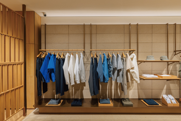 「Goldwin Nanjing」は、伝統的素材の可能性を追求する建築設計事務所である「新素材研究所」と協業し、自然との調和のある美しい店舗空間を創造します。「ゴールドウイン」ブランドの一貫したミニマリズムデザインを踏襲し、静寂で繊細な自然を象徴する「地層の美」をテーマとした空間を演出します。店舗全体には、中国大陸の堆積岩(砂岩)素材を使用し、手作業でのビシャン仕上げが施されています。日本的な美意識と、長い年月をかけて生まれる自然の造形美を融合した空間となっています。