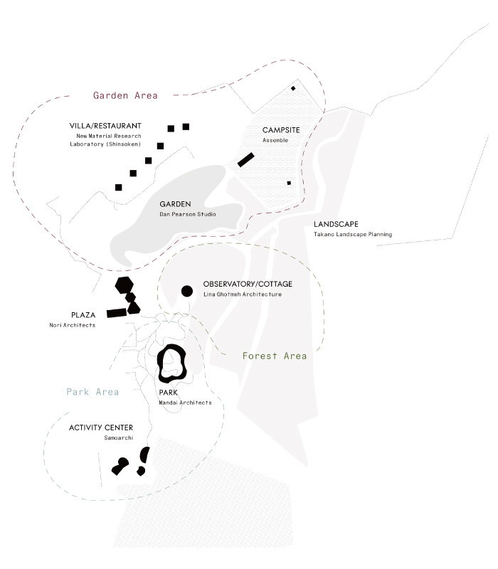 森の先には、自然の美しさに触れる「ガーデンエリア」が広がります。多様な種が共生する自然界に学びデザインされたナチュラリスティックガーデンは、私たちに四季を通して自然の営みを感じさせてくれます。そのガーデンと隣接するヴィラや、キャンプサイトなど、自然の営みに学ぶ、新しい自然との生活を体験できます。この3つのエリアに6つの建築を設計し、原体験となる機会をデザインします。