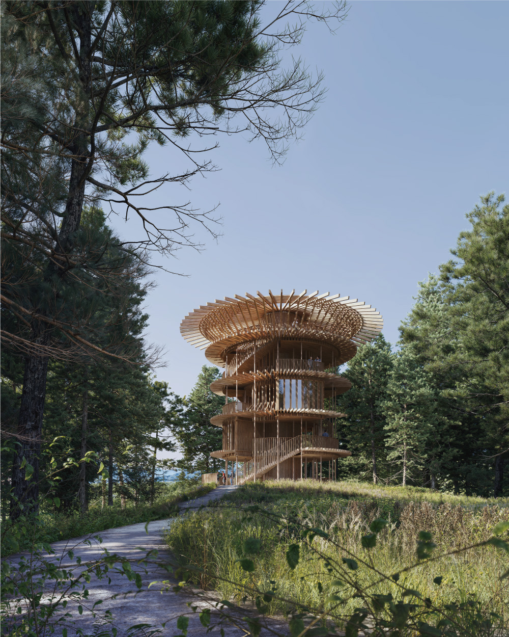 中心に位置する展望台は、自然観察の拠点であり、螺旋状の階段を上ると、それぞれの方角に自然観察エリアを設けています。最上部からは砺波平野を見渡せ、地下階ではガラス越しに土中の根や虫を観察でき、自然の中にある不思議を探求する体験を提供します。さらに周辺の森に点在するコテージは、森の中に滞在しながら、動植物をゆっくりと観察できる拠点となります。