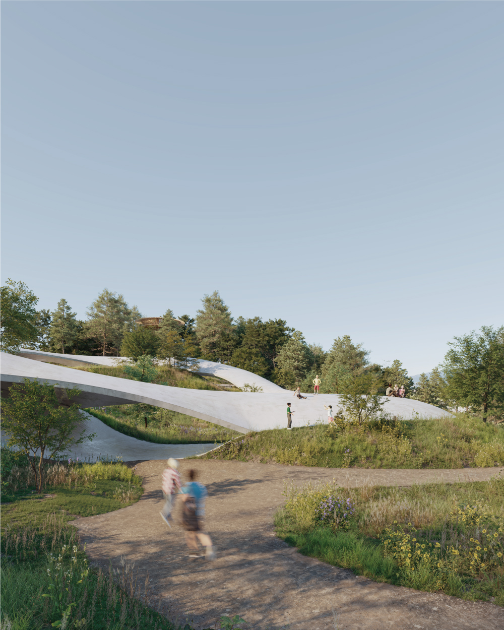 地球との遊びが生まれる「パークエリア」。子どもは好奇心のままに遊びを深めます。その子どもたちの背中を押すような、直感的に走り出したくなるランドスケープ、遊具のような建築を中心に設計し、地形と会話をするように登ったり、滑ったり、子どもたちが地球との遊びを自由につくるエリアになります。