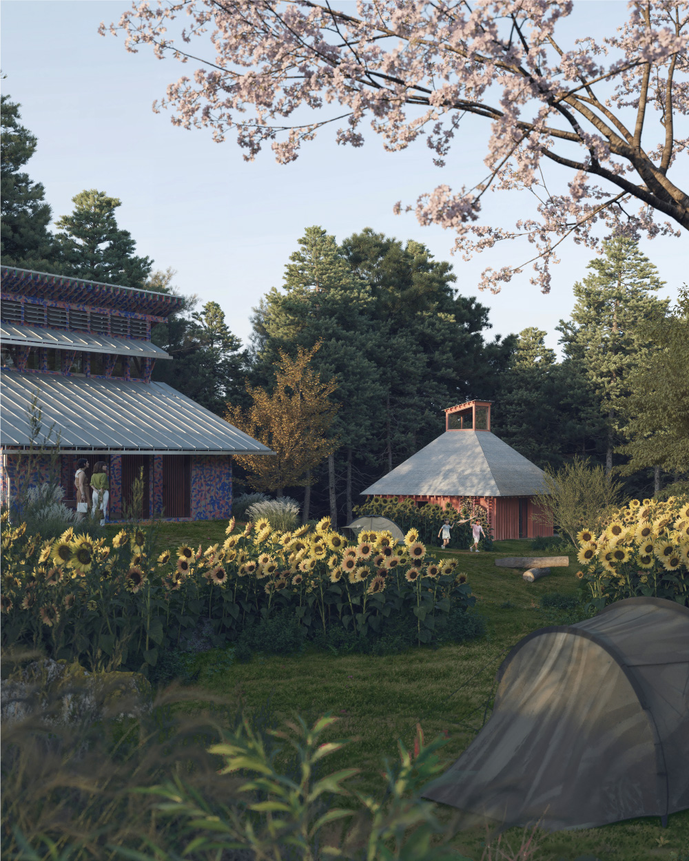 キャンプサイトでは、富山に根付く農業や工芸、自然との関わり方を学ぶ、新しいキャンプ体験を提供します。かつての水田の地形を活用し、それぞれのキャンプサイトごとに異なる植物を育て、それらを使った農業や工芸の知識や技術を知ることができます。大きな焚き火台を備えたキャンプストアや調理棟など、快適にアウトドア体験を提供する施設も整備します。地域の木材や粘土、籾殻、釉薬を使ってデザインした建築が、自然と地域文化が融合する特別なキャンプ体験を演出します。