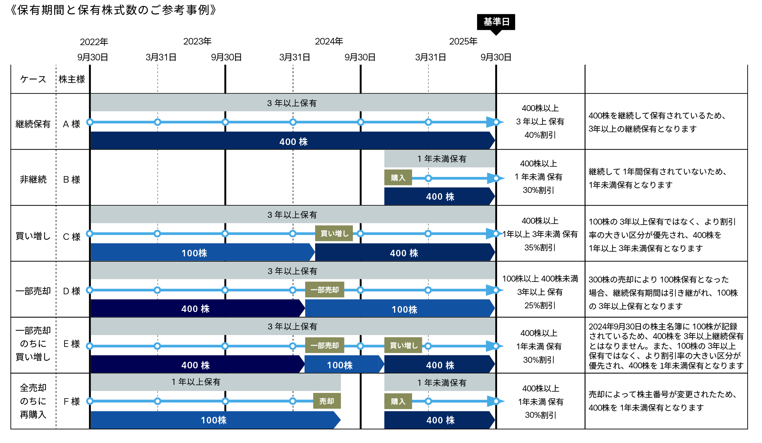 「保有期間3年以上」とは、基準日(毎年9月30日)の当社株主名簿に記録されており、3年以上連続して当社株式を上記枚数保有(毎年9月30日、3月31日時点の当社株主名簿に同一の株主番号で 7回以上連続して記録)されていることとします。