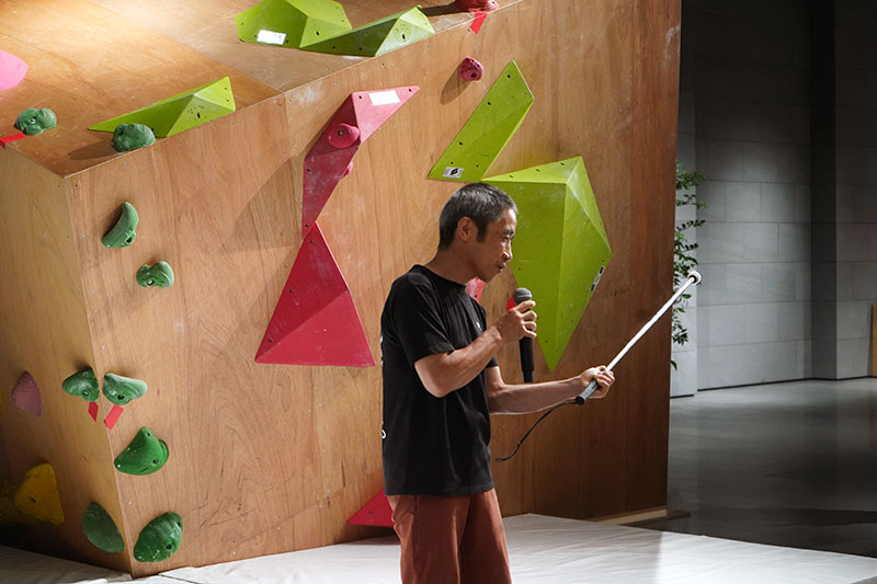 小林代表は目の見えないクライマーをガイドする際には次のホールドの場所を「HKK」=方向(H)、距離(K)、形(K)で伝えることがポイントだと説明しました。特に方向は時計の文字盤を用いて「2時近くにサツマイモ」のように適当な距離と形のイメージを合わせて伝えるそうです。ガイドはあくまでクライマーが見えないホールドの場所を教えるのみ、身体の動きはクライマー自身が考え、工夫しながら登ることで一緒にクライミングを楽しむことができます。体験した平山氏は「手の感覚が研ぎ澄まされ、触れたときに視覚がよみがえるようだった」、伊藤氏は「自らのガイドでクライマーが登れたとき自分のことのように達成感を得られた」とコメントしました。