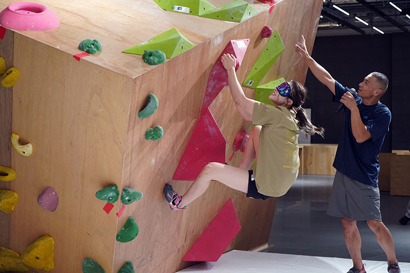 イベント初日には、モンキーマジックの小林幸一郎代表、ザ・ノース・フェイス契約アスリートでクライマーの平山ユージ氏、伊藤ふたば氏、チャムス契約アスリートの小田菜摘氏によるブラインドクライミングデモンストレーションが行われました。