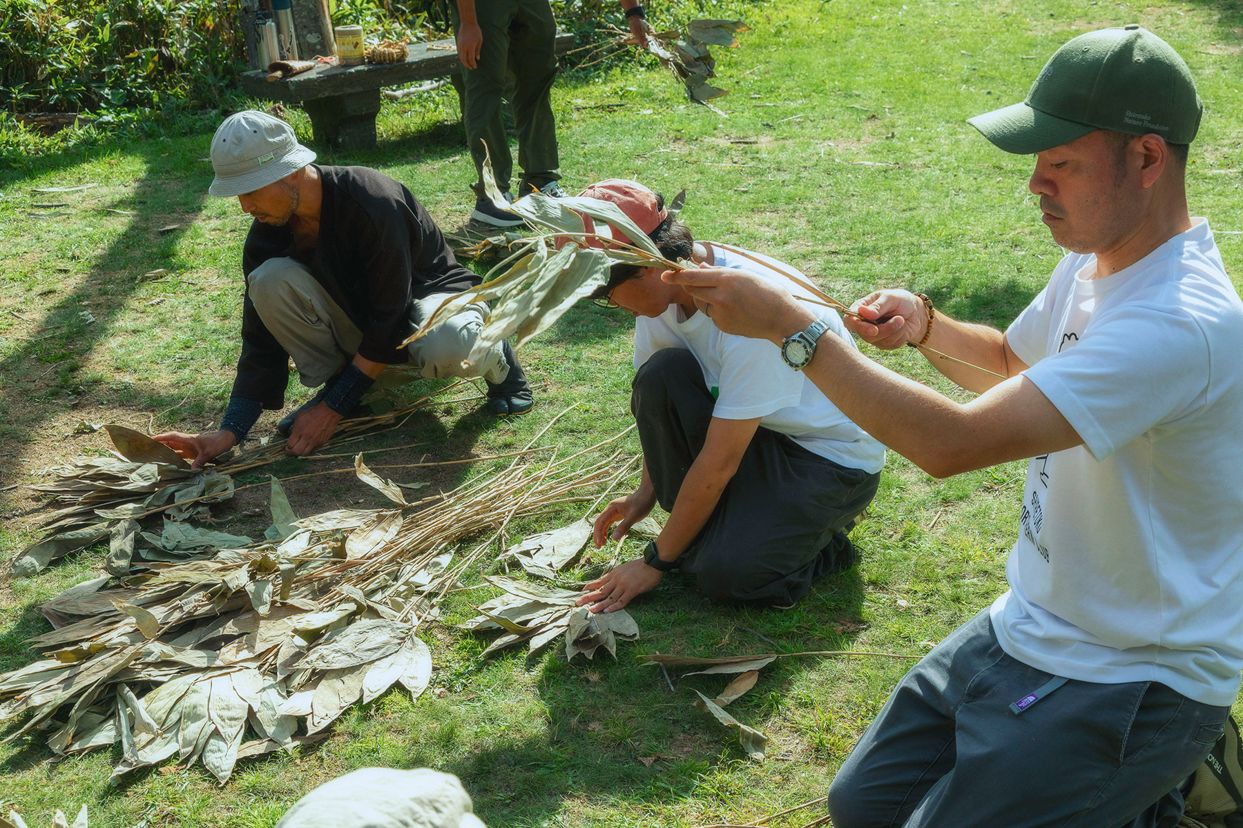 他の植物の成長の妨げとなったり、熊との不意の遭遇のきっかけとなるため、知床の森で厄介者として扱われる笹。そんな笹を、アイヌの人々は身近な素材として屋根や壁に組み込むなど暮らしに取り入れてきました。茅葺職人・藤原タクマさんを講師に迎え、アイヌの知恵と日本の伝統的な茅葺職人の技術を活かし、参加者みんなで協力して知床の笹を活用し、森とつながる“ひみつ基地”をつくるワークショップを開催しました。