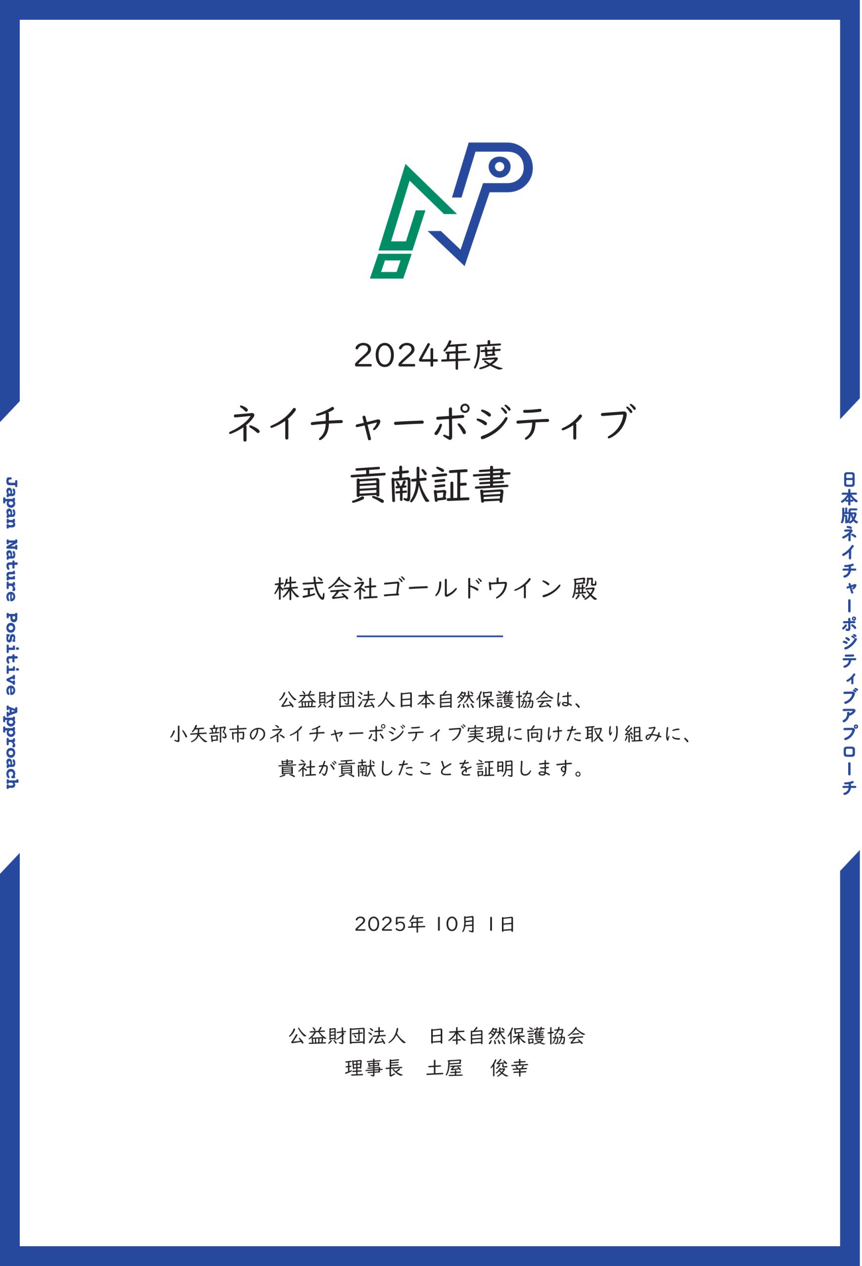 株式会社ゴールドウイン(本社:東京都港区/代表取締役社長CEO:渡辺 貴生)は、公益財団法人日本自然保護協会より「ネイチャーポジティブ貢献証書」を授与されました。
