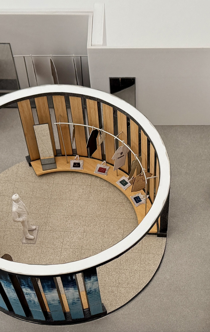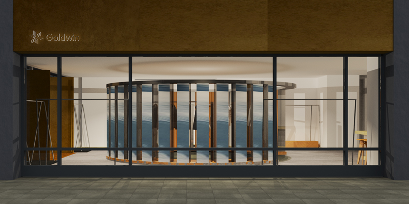 この空間の核となるのは、ガラスのファサードに面して中央に構えた環状の「社(やしろ)」です。ここはGoldwinのスタイルや理念を世界へ発信するステージであり、訪れる人々を物語の中心へと誘います。その外周には、時代を超えて愛されるスタンダードな商品を静かに配置し、空間のすべてが街ゆく人々の目を惹きつける一つの壮大なショーウィンドウとなるよう設計しました。