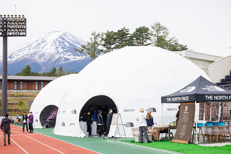 会場内に、物販およびカフェ機能を備えたザ・ノース・フェイスのドーム型テント(直径14m / 11m)を2張設置し、トレイルランニングシューズやランニングコレクションの販売、カフェメニューの提供を行います。カフェ内では、テーピング講座や環境保全に関するトークイベント、国内外の女性アスリートを囲んでドリンクを飲みながらコミュニケーションを楽しむWomen Athletes Meetupを実施します。
