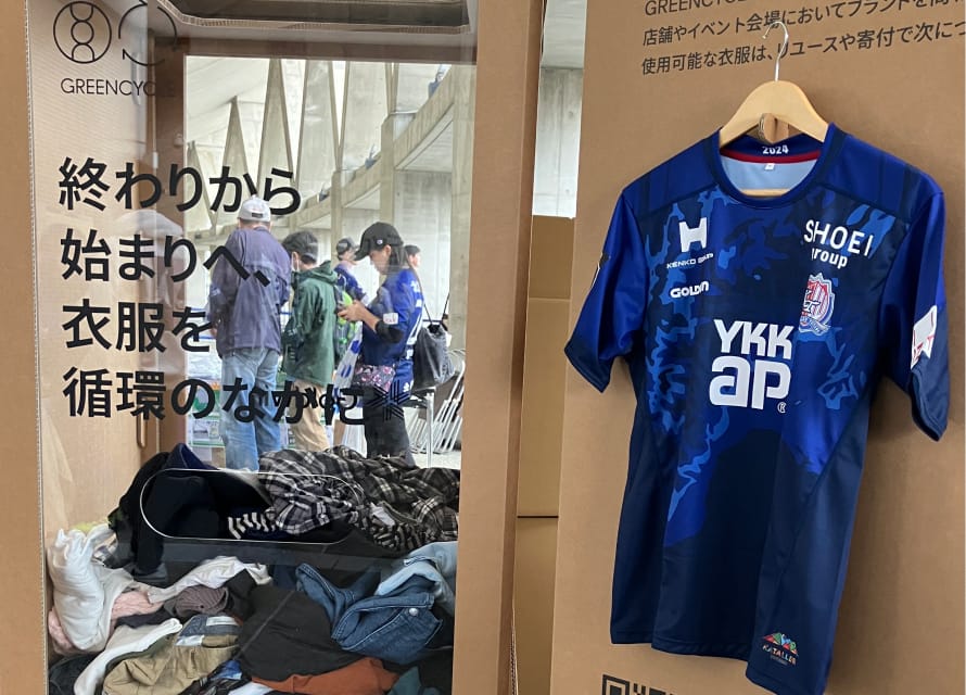2022年シーズンよりカターレ富山のホームゲームでサポーターからの不要衣類の回収を開始し、2024年度はホームゲーム会場にて9回、合計1,046kgの衣服の回収を実施しました。また2024年に引き続き2025年度も「羽毛布団の回収」も実施。循環型社会構築にむけて地域の人々と一緒に、環境を改善するアクションに取り組みます。